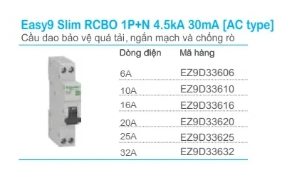 Cầu dao bảo vệ quá tải, ngắn mạch và chống rò Easy9 Slim RCBO 1P+N 4.5kA 30mA Schneider