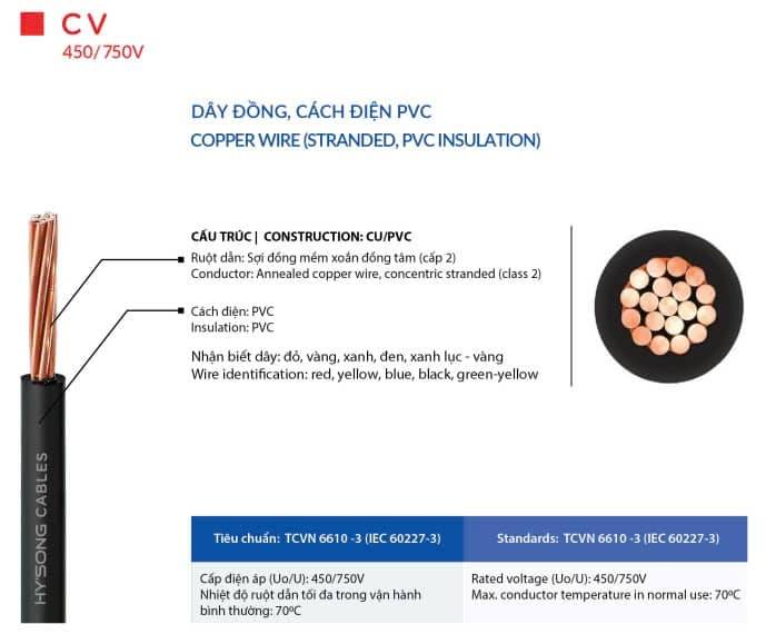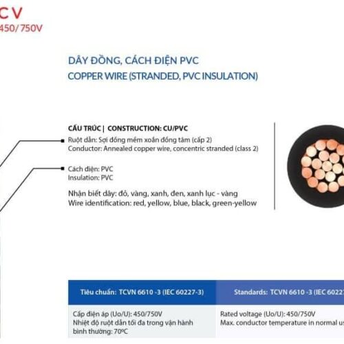 – Cấu trúc ( Ruột Dẫn ): sợi đồng mềm xoắn đồng tâm (cấp 2 ) . Cách điện PVC
